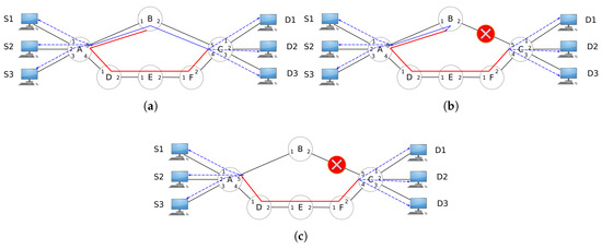 The application of LONG in a simple topology is depicted in Figure 4, in which the source hosts (S1, S2 and S3) communicate with each destination host (D1, D2 and D3). In Figure 4a, the path [A, B, C] is the primary path for flows from source to destination hosts. LONG applies a protection rule from Node B to Node C (path [B, A, D, E, F]). Thus, if any of the links A-B or B-C suffers a failure, the backup path will be used automatically with the OpenFlow feature of FF. That way, path [A, B, C] is protected.