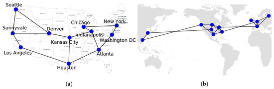 Topologies adopted in this work. (a) The representation of the Abilene topology. (b) The representation of a WAN Google topology.