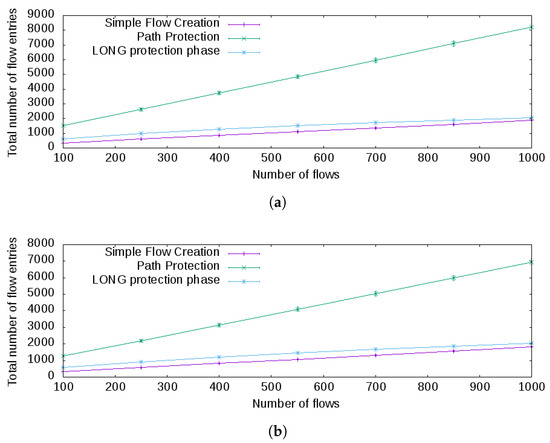 The baseline for analysis is the simple flow creation. This algorithm uses one flow entry in each OpenFlow switch for every flow created in the path between the endpoints. Compared against path protection, path protection consumes much more flow entries on average to connect the endpoints in both topologies; see Figure 6a,b, respectively. This result is expected, as for each flow, a protection path must be created, as well, and that protection path avoids the unavailability of the flow in the presence of a link failure.