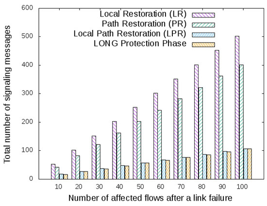 Regarding LPR and LONG, they notoriously overcome LR and PR for signaling overhead criteria (see Figure 7). The LPR signaling to OpenFlow switches belongs to a new path, and the LONG restoration phase sends control messages for the affected OpenFlow switches to restore the optimal shortest paths of the flows between endpoints. Then, based on the results achieved, LPR and LONG are almost equivalent among the signals sent to the controller.