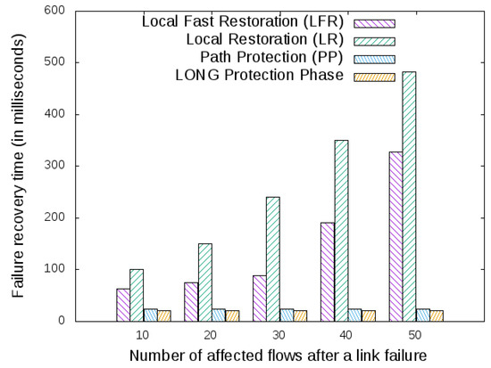 For the sake of space, two restoration and two protection resilience mechanisms were selected to investigate the metric failure recovery time. For the restoration approach, Local Fast Restoration (LFR) and Local Restoration (LR) were used. Both restoration approaches require signaling to the SDN controller to recover from a link failure. However, this is not the case for the protection mechanisms, which is the case of path protection and the LONG protection phase, as all recovery rules are already installed inside the OpenFlow switches, and those rules protect the network from a link failure.