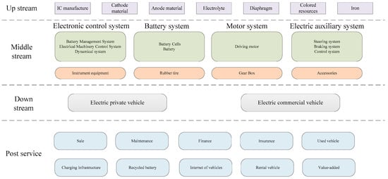 The development of electric vehicles needs the favorable support of each link in the industrial chain. As shown in Figure 1, the electric vehicle has achieved a breakthrough in the upstream, middle stream, and downstream aspects of the chain. The support of the post service is the most important chain in realizing industrialization. In the post service industry chain, charging infrastructures and electric vehicle battery recycling become very important. If the charging infrastructures cannot be developed well, the electric vehicles will not have the health circulation to be promoted.