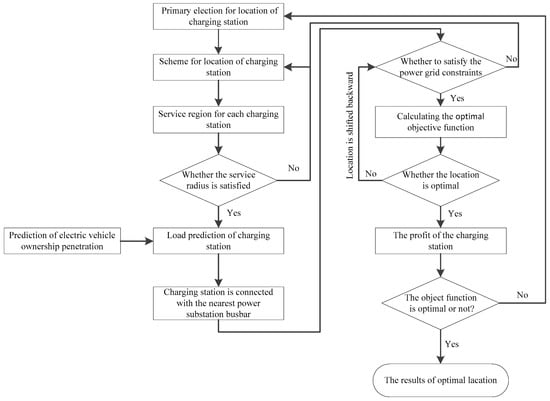 With the depletion of oil resources and the aggravation of environmental pollution, electric vehicles as the main force of the new energy consumption revolution has attracted greater attention from various countries []. Vigorously developing electric vehicles can speed up the replacement of fuel and reduce vehicle exhaust emissions. Improving the charging infrastructure system is essential for the mass implementation of electric vehicles [,]. Distributed charging stations are an important way to supplement the energy of electric vehicles, which can affect the daily life of electric vehicle drivers. Their sizes and locations would also have an important influence on the application of electric vehicles. Therefore, in a section of traffic, detailed requirements and conditions need to be considered for developing the programming of a charging station, for example, the traffic convenience, service radius, requirements of safety, price of land, and municipal planning. In the section of the power system, some conditions also need to be considered, like the allowed capacity of the distribution network, and line running demand, etc.