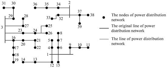 The detailed nodes of the power distribution network are shown in Figure 3. The black points represent the nodes of the power distribution network. Each of them can be connected with charging stations. The bold stripes are the original lines of the power distribution network. In general, there are only a few of them, which are connected with power companies. The pinstripes are the lines of the power distribution network, which aim to make connections between each node of the power distribution network.