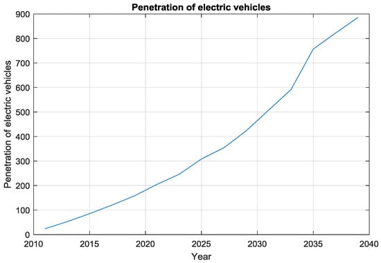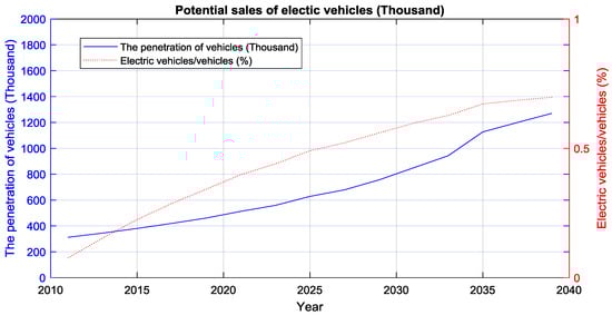 In this figure, the ratio of electric vehicles slightly increased from 2010 to 2040, which means that the ratio of electric vehicles to total vehicles increased slightly. Between 2035 and 2040, the tendency of the ratio of electric vehicles to increase is slow because, in those years, the increasing rate of sales of the vehicles is reduced. The predictions of the penetration of electric vehicles are shown in Figure 7.