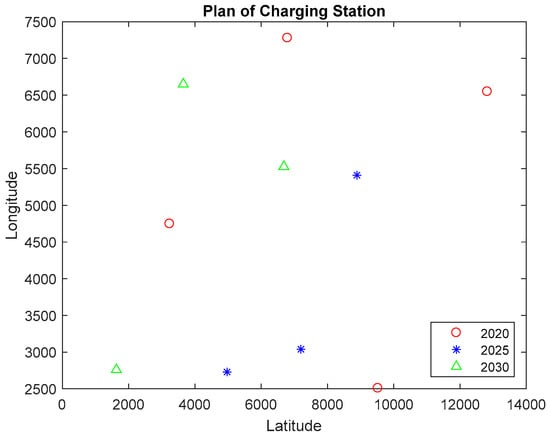 Compared with the method described in this paper, the plan of the government has a reduced utilization ratio in most of the planning points. Only No. 1 and No. 9 in 2030, adopted by the government, have a higher utilization ratio than the method we have developed. The optimal locations of the charging stations are presented in Figure 8.