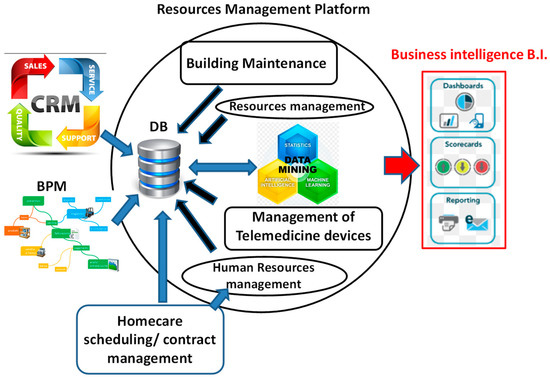 The reengineering of homecare assistance processes represents an important issue about de-hospitalization. In this direction, resources management platforms (RMPs) could support and optimize the management of nurse and doctor activities, thus reducing unnecessary costs. A good way to manage homecare activities and patient analyses is to design a platform embedding the typical customer relationship management (CRM), enterprise resource planning (ERP), and business process modelling (BPM) facilities, and an innovative decision support system (DSS). The idea is to improve a basic RMP platform through the gain of knowledge provided by a DSS based on data-mining techniques. The knowledge of other important outputs such as key performance indicators (KPIs), scores of the human resources associated with the homecare assistance processes, and other dashboards can furthermore improve resource management and the quality of the patient assistance. In particular, a tailored telemedicine network could facilitate patient control by means of a control room connected in the cloud with smart sensors used by patients at home. The management of nurses can be optimized by analyzing before critical cases such as chronic cases, historical physiological data, and predictive results about patient status emerge. This paper presents a case study, thus providing a feasibility study of a tailored RMP-DSS platform suitable for the management of de-hospitalization processes.