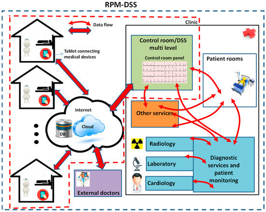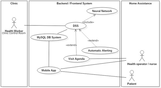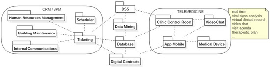 Figure 6 illustrates a complete UML diagram indicating all the features of the RMP-DSS prototype system. In this architecture, it is possible to better distinguish the telemedicine features from those of the RPM, being the DSS, the data-mining engine, and digital contracts the linking of all the features.