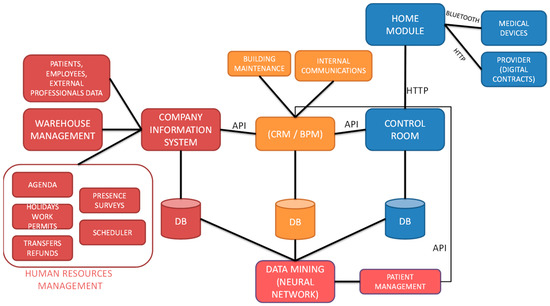 The database of the platform is split into two databases based on the MySQL relational database management system (RDBMS). A database is used for storing the data related to the ticketing, and therefore, is dedicated to the management of the various business processes, while the second one is used by the telemedicine web application in order to store patient information and their physiological data. The two databases are synchronized through a synchronization component that allows to orchestrate all the available functionalities. In Appendix A are reported more details concerning the databases, showing the entity-association diagram of the ticketing service. In Figure 3, a block diagram representing all the functionalities of the designed RPM-DSS is illustrated. In this diagram, it is clear how the data-mining engine is interconnected with the company information system; patient data are processed by neural network algorithm, thus providing more information about patient status evolution. The data processed by the neural network will optimize the visits scheduling and the assistance service. The data flow of Figure 3 embeds other process management such as human resources, warehouse, internal communications, and building maintenance.