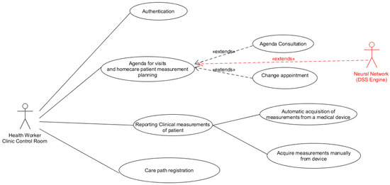 The function of the Health Worker (see Figure 4) is to read real-time patient data and to execute the DSS engine which will process data stored in a MySQL system according to the generation of automatic alerts. The Health Worker can plan or modify the visit agenda of the Health Operators, basing their decision on the outputs generated by the DSS. The patient will transmit physiological data by a mobile app interfaced with a backend system; this mobile app can also connect operators to the system with the purpose of supervising activities. The data sent by the mobile app are stored in the MySQL database and then processed by the DSS engine. Possible trends or individual anomalous values are automatically detected by the system, which alerts the medical staff of the clinic (Control Room).