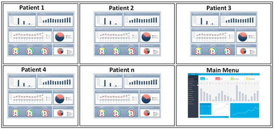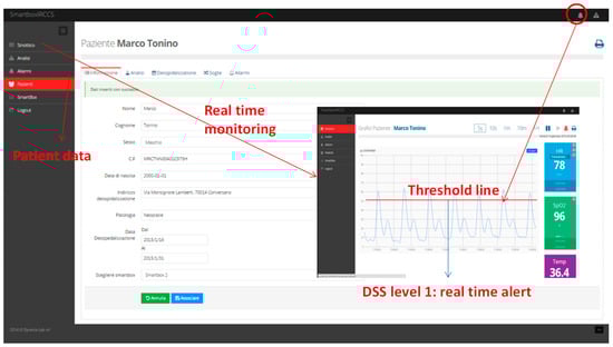 Figure 7 illustrates the layout of the developed control room panel. The realized web interface is able to select the patient and the related tablet enabled for the measurements (the tablet is identified by an ID code), and the “Synoptic” command provides, as output, real-time graphs of the connected devices (the sampling time can be set to 5 s, 10 s, 1 min, 10 min, and 1 h). During the real-time patient monitoring, the panel will switch on an alert in the case of an exceeded threshold. This real-time alerting represents the first level of the DSS system (DSS level 1).