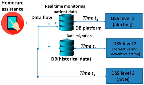 The data of the MySQL DB of the platform can be migrated into another DB system able to collect historical patient data of multiple patients. This last system can be big data such as the Cassandra DB. The collection of several types of data is important for the learning of the ANN algorithms; more data will enable the model to learn efficiently by decreasing the prediction error. Figure 8 illustrates the complete DSS architecture structured in three main levels. This scheme follows architecture studied in predictive maintenance approaches adopted in other application fields concerning prediction of machine break-down [30]. The DSS level 1 consists of the alerting process provided by the real-time monitoring of the patient through the control room panel allowed by the real-time monitoring function. This level uses the MySQL DB of the prototype platform. The observation of many alert conditions of level 1 induces the system to enable DSS level 2, having the function to correct the visits planning for a preventative action by avoiding critical situations. The DSS level 2 works with the DB of the platform. Finally, DSS level 3 is based on an MLP-ANN algorithm having the function to predict patient health status by processing historical data and real-time ones. The DSS level 3 can utilize data of the DB platform or big data system containing massive historical physiological data. The data migration from the DB of the platform to the big data platform is managed by cron (php script) which periodically updates the patient data bank.