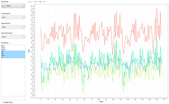 The experimental physiological dataset is made by different attributes such as heart rate (HR), mean arterial pressure (MAP), systolic (SYS) (mmHg), and diastolic (DIA) (mmHg) signals, concerning measurements performed during two months (measurements acquired in different 36 days for a total of 168 records for each attribute). We observe that the MAP is the average blood pressure in a cardiac cycle, and it represents the average pressure imposed on the patient’s arterial walls. Map can be estimated using this formula: map = diastolic pressure + (1/3) × pulse pressure. In Figure 9 are illustrated graphically the attributes of the experimental dataset.