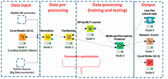 The experimentation focused on systolic values by applying the KNIME workflow of Figure 10. The proposed workflow is suited for data pre-processing and data processing implementing an MLP ANN algorithm. Different objects, named nodes, are connected in order to execute the training and the testing phases. Below are described the function of each object: