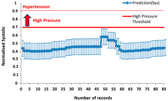 The procedure used for the parameter setting follows the same order as Figure 12a–d. It is fixed before the number of the hidden layers providing the minimum error, then it is fixed for the maximum number of iterations at minimum condition, successively it is set to the number of hidden neurons per layer, and finally the partitioning of sampling approach. In order to analyze better the error plot behavior during the iteration process, Appendix B displays the error plot trend for each iteration before the 50 iterations by observing that the error decreases drastically after only nine iterations. In order to read correctly the predicted results as reported in Figure 11, error bars having an amplitude of ± 0.138 equal to the calculated mean absolute error are presented (the total error bar amplitude is 0.276). By observing the high-pressure threshold and the predicted results it is clear that there are no risks for the monitored patient about high-pressure or hypertension conditions. If the error bars remain during the MLP-ANN calculation below the high-pressure threshold line, the DSS level 3 will not activate the alerting condition. For the opposite, if the error bars overcome the high-pressure and hypertension thresholds for a certain number of records, it will enable the alert condition, thus activating in the RPM-DSS the emergency assistance ticket concerning a request for an urgent analysis to be performed in the clinic, further supervision of a nurse, etc.