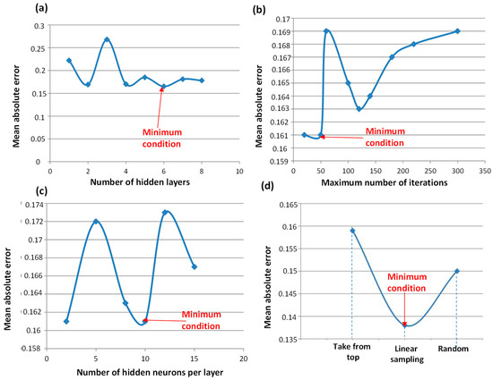 Choice of the parameters performing the lower mean absolute error: mean absolute error versus number of hidden layers (a); versus maximum number of iterations (b); versus number of hidden neurons per layer (c); and versus different sampling approach for the partitioning (d).