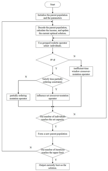 In this paper, we propose an improved genetic algorithm. The improvements include the design of crossover and mutation operators for different individuals, and an improved roulette selection operator. The flowchart of the algorithm is shown in Figure 4.