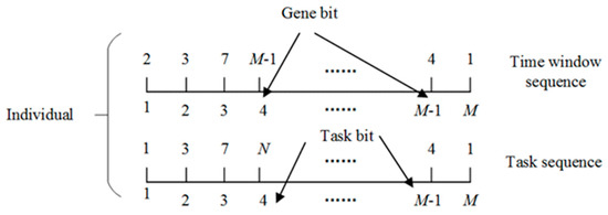 M and N respectively represent the number of time windows and the number of tasks needed to be planned. An individual is a matrix composed of integers. The value on the gene bit represents the corresponding time window. The value on the task bit represents the task number corresponding to the time window on the current gene bit. A task may have several time windows that can be selected, that is, a task number may correspond to several time windows. The initial population is generated randomly. For example, if M equals 5, N equals 3, it means that the number of time windows is 5, and the number of tasks is 3. An individual G may be encoded like this: