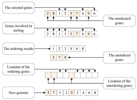- Step 5: Perform the following operations on the two individuals. Select a gene, with the lowest efficiency of comprehensive relative resource utilization selected by and with the highest efficiency of comprehensive relative resource utilization selected by W, and not selected by . If the comprehensive relative resource utilization efficiency of is lower than that of , then rank in the first gene bit of genome.