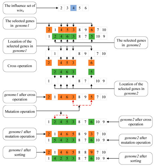 In this paper, we introduce new changes through crossover and mutation operations. The crossover and mutation operation can only be carried out within the influence set of the time windows. This is because the time windows in interact with . It is possible to generate new individuals by changing the ordering between the interacting windows so that the partial modification of the genome can be realized, while the genetic information of the rest of the genome can be preserved at the same time. In addition, we use the time partially ordering constraint to sort the new genomes in order, to ensure that the new individual still satisfies the time partially order constraint. Therefore, we propose an influence set crossover-mutation operator (ISCMO) to cross and mutate the genomes within the time window influence set, in order to obtain new individuals and to ensure that the new individuals fully meet the partially order constraints.