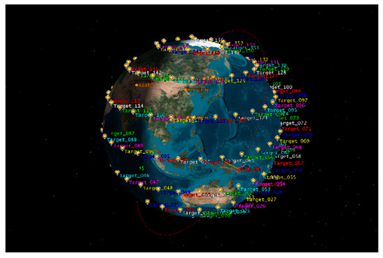 Experiment 1 and Experiment 2 are a group of comparative experiments. They compare the effects of different resource states on task scheduling under the same condition of low overlapping of time windows. We set 156 observation points evenly distributed on the nine dimensions of the Earth to simulate Experiment 1 and Experiment 2, as shown in Figure 9. The minimum elevation angle of the targets are random numbers between [50, 60].