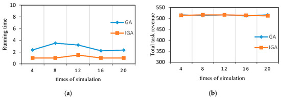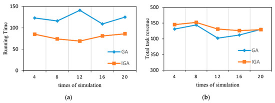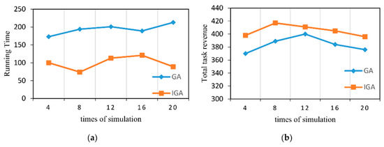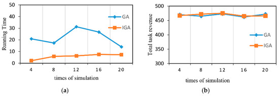 In Experiment 1, both the time constraints and resource constraints are relatively loose. From Figure 10a,b, we can see that the maximum task revenue of GA and IGA are almost equal, but the running time of the IGA is only 50% that of the GA.