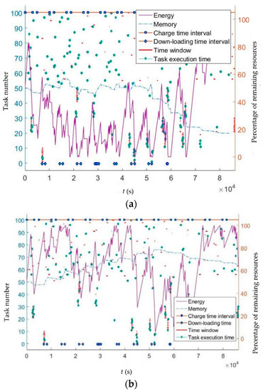 Figure 14a,b is the local task execution plans of IGA, which were randomly selected from Experiment 4. We chose Experiment 4 because in Experiment 4, the time constraints and resource constraints were more stringent, and the experimental results were more representative.