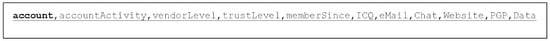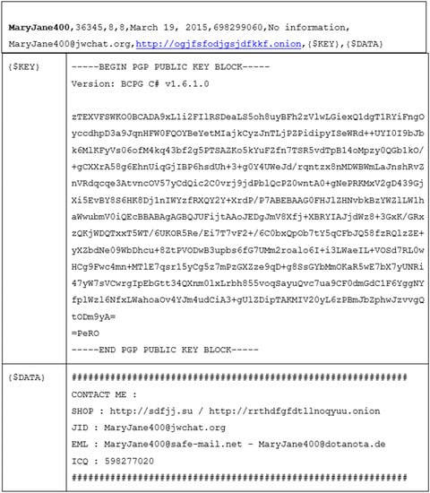 Each marketplace category provided up to 50 pages of listings. Within each page, up to 15 items were listed for sale. The format of each of these listings was consistent, thereby allowing the AppleScript to record the relevant information—in particular, the Account Name of the seller, which would later prove to be key. An example of a listing, pulled from the marketplace, can be viewed in “Figure A6” in Appendix A. After pulling the data for more than 30,000 items for sale, a second AppleScript was written to download the account details for all the marketplace sellers. The Web URL for an Account listing was also comprised of three critical parts, as displayed in “Figure A7” in the Appendix A. Analogous to the previous example, the first part of the URL, displayed in “Figure A7”, is the marketplace address. The second part of the URL is the account name, which was taken from the listings and which was obtained (scraped) by the first script. The third part of the URL, displayed in “Figure A3” in Appendix A, is the user tab view. The marketplace account pages were comprised of six different tabs, two of which were scraped by our script; the “About” tab listed user-provided information, which included email addresses, chat accounts and free form data; the “PGP” tab listed the user’s PGP encryption key, which was a requirement for every seller. PGP (Pretty Good Privacy) is an encryption protocol used for secure communications, i.e., to prevent a third-party from eavesdropping on a user’s email conversation. The rationale for capturing the PGP key was that it could potentially be later used to positively identify a vendor or customer if a suspect’s computer was ultimately seized. Additionally, the PGP key, and Account Name, could potentially be used to link sellers on multiple marketplaces; many vendors who were operating in our case study marketplace maintained a presence on multiple Dark Web marketplaces. The About tab contained information that may be of interest to an investigator and included email/chat addresses, preferred currency and time zone.