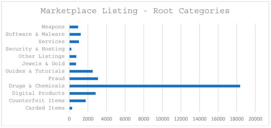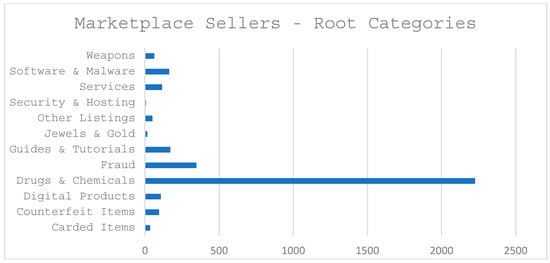 Figure 6 and Figure 7 below provide some perspective about the marketplace listings, i.e., types and quantities of unique items being sold, and the number of unique sellers offering those items for sale, in each of the marketplace categories. In particular, Figure 6 shows the distribution of items for sale across the twelve root-level categories within the marketplace. The “Drugs & Chemicals” category has by far the most listings, with 18,358 (55% of the total), and illustrates how drugs represent the vast majority of transactions on Dark Web. Figure 7 displays the number of unique sellers who are offering those items for sale. Again, the “Drugs & Chemicals” category has the most unique sellers, with 2226 vendor accounts (66% of the total) mirroring the results of the most common item sold.