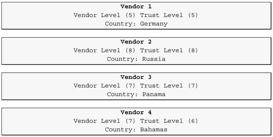 Ultimately, using Maltego, we positively identified four vendor accounts, amongst the most active accounts, as noted in Figure 8. However, none of these vendors appeared to reside in the United States. Figure 8 displays the vendors identified (the actual names of the vendors have been redacted for security reasons). Based on the data pulled from the marketplace, “Vendor Level”, i.e., number of active product listings, was generally higher for the most active vendors. The value assigned to “Trust Level”, is based on customer ratings and satisfaction with vendors. We do however know that these four vendors were very active on our subject Dark Web marketplace.