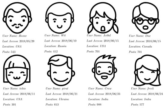 - Zheng, X.; Lai, Y.M.; Chow, K.P.; Hui, L.C.; Yiu, S.M. Sockpuppet detection in online discussion forums. In Proceedings of the Seventh International Conference on Intelligent Information Hiding and Multimedia Signal Processing, Dalian, China, 14–16 October 2011; pp. 374–377. [Google Scholar]