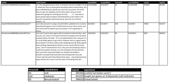 Snippets of the hackingPosts, forums, and topics tables from our dataset.