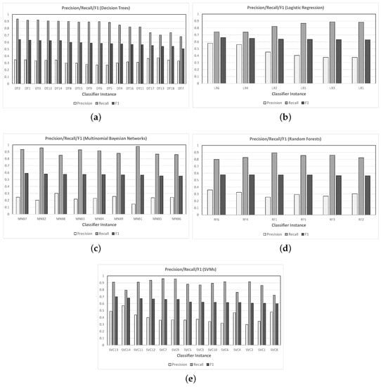Precision, recall, and F1 values for all classifiers evaluated in Phase 1: (a) Decision Trees, (b) Logistic Regression, (c) Multinomial Bayesian Networks, (d) Random Forests, and (e) Support Vector Machines. In each graph, classifier instances are sorted in descending order of F1 measure.