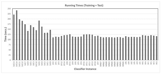 Running time taken to train and test each classifier instance from Phase 1, sorted by their F1 measure in the charts from Figure 3.