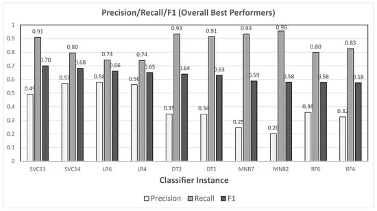 Best two performers from each chart in Figure 3, sorted by F1 measure.