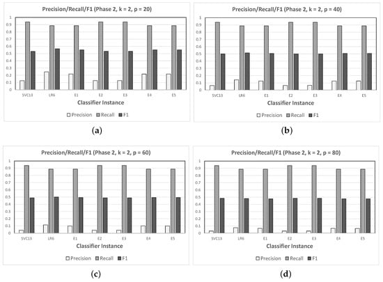 The first thing that was evident when analyzing the results was that all classifiers’ performance with respect to precision was much lower than those obtained in Phase 1. This can be explained by the sharp increase in the number of users with respect to the previous experiment (from 10 to 56)—giving many more opportunities for the classifiers to yield false positives. It should be noted, as before, that a classifier working by randomly answering yes one out of n times (for n users) would only have precision . Therefore, the values of 0.2468 (LR6) and 0.2176 (E1)—the two best when —were about and times higher, respectively. Furthermore, precision became lower as p increased, reaching (LR6) and (LR6) for (still about and times better than chance, respectively). On the other hand, recall remained quite good for all classifiers, irrespective of the value of p, and was consistently better for SVC13—and all ensembles dominated by SVC classifiers—compared with LR6 (which had higher precision).
