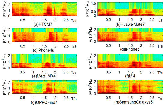 A spectrogram is a visual representation of the spectrum of a speech signal which changes with time. In order to study the differences between speech files recorded by different cell-phones in different frequency bands, Figure 1 shows short-term Fourier transform (STFT) domain spectrograms of speech files recorded by the same speaker simultaneously with 8 cell-phones in a quiet office environment. As can be seen from the figure, the spectrograms of speech files recorded by different brands of cell-phones vary greatly. For example, HuaweiMate7’s energy is rapidly reduced near 0.7 kHz, but the decrease of Mi4 is near 1 kHz. The energy distribution of other bands’ cell-phones and the frequency band of sudden changes in energy are also different. However, for different models of the brand Apple, the spectrograms are very similar.
