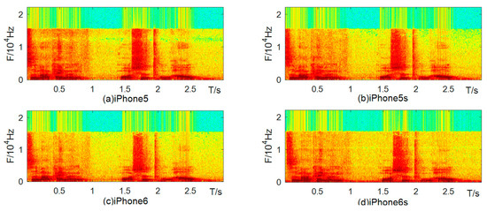 To analyze the frequency difference of different models of cell-phones from the same brand, Figure 2 plots the spectrograms of speech files recorded by different models of Apple cell-phones. Although the four images are very similar, with a rapid energy change at around 1.5 kHz, there are still some differences. For example, the iPhone 6 has lower energy in the 0–1.5 kHz band than the other three phones. The iPhone 5 and iPhone 6s have distinct peaks in energy at around 1.2 kHz and 1 kHz, respectively, and the other two phones do not.