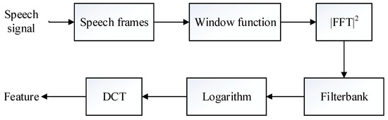 Almost all of the features in cell-phone source recognition are extracted from the Fourier transform domain of the speech signal. The most popular features for recognition systems are the MFCC and LFCC. Their extraction procedure is shown in Figure 3. Firstly, the speech signal is divided into overlapping frames, and each frame is windowed using an appropriate window function. Then, the power spectrum is computed using the fast Fourier transform (FFT), which is then smoothed with a bank of triangular filters whose center frequencies are uniformly spaced on the different scales. Finally, logarithmic filter bank outputs are converted into features by taking the discrete cosine transform (DCT). In this paper, we use 30 millisecond frames with a 15 millisecond overlap and a Hamming window. For every speech file, the dimensions of MFCC and LFCC are both set to 24.