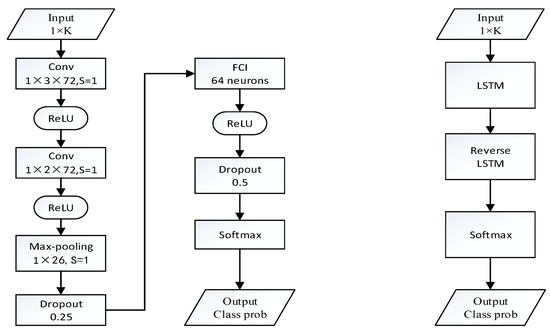 Network framework for different depth learning classifiers. Left: CNN Right: RNN-BLSTM.