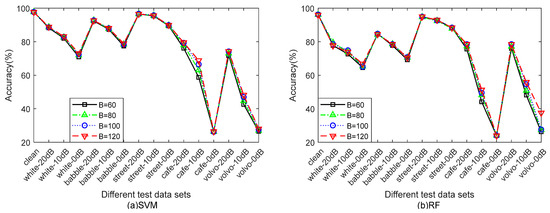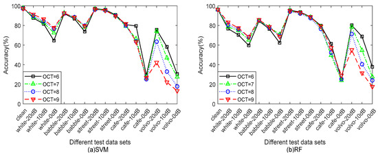 Figure 6 shows that the performance of the spectral distribution features of different OCT values when B is 100. The accuracy of the device recognition experiments are compared by using two traditional classifiers—SVM and RF, respectively—on the CKC-SD database. It can be seen from the figure that different OCT values have similar effects on the recognition of different test sets under the two traditional classifiers. As the OCT value increases, the accuracy of the noisy speech files containing white noise and babble noise gradually increases, but that of the speech files containing Volvo noise drops sharply, and the remaining speech types are not significantly affected, except for cafe noise. Considering the complexity of the algorithm and the influence of different OCT values on the accuracy of different noise types, the OCT value is set to 7.