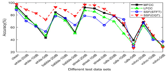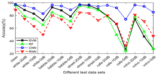 Figure 9 compares the performance of SSF (CQT) under four different classifiers. It can be seen from the figure that the traditional SVM and RF classifiers have an almost identical recognition effect for clean speech files, but there are differences for noisy speech files. The classification effect of RNN on the clean speech test set and the noisy speech test sets with white noise, babble noise, and street noise is significantly worse than that of the traditional classifiers, but the recognition effect in unseen noisy speech is better than the traditional classifiers, especially for Volvo noise, where the highest accuracy shows an increase of about 20%. Surprisingly, the accuracy of CNN on the 16 test sets is higher than that of the other three classifiers, especially for the speech test set of unseen noisy scenarios, the performance of which is greatly improved. In the test sets of cafe and Volvo noise with different noise intensities, most of the accuracies are higher than 90%, with the lowest accuracy also being greater than 70%.