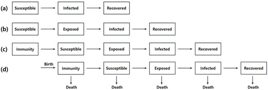 Extending the SIR model involves two key ideas. The first idea is to subdivide the class [14]. In Figure 1, there are the basic SIR model and its variations. To improve the model, it is necessary to understand the practical characteristics of the disease. For example, empirically, people have a certain incubation period before they show symptoms of the disease. Such an observation leads to adding the exposed class to the model, and the model becomes an SEIR model. Similarly, if we consider some immune people, SIR has evolved into an MSEIR model. Lastly, if we consider life cycles such as the birth and the death [15] of the population, it becomes an extended model of MSEIR as we can see in Figure 1d.