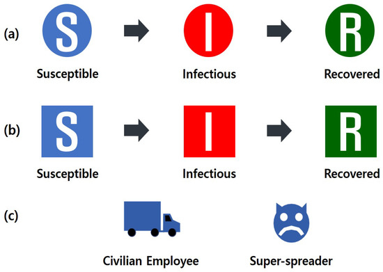 Symbol of agents of the model: (a) agents in a GP; (b) agents in a CP; (c) special agents (Civilian employee, Super-spreader).