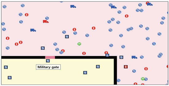 Figure 4 is a part world of the simulation model. To conduct an experiment reflecting two distinct worlds, a black border is used to divide the space. So, the external and internal populations can be adjusted according to user definition. The pink patch is the area of GP and the yellow patch is the area of CP. The military gate is the only passage that connects the outside and the inside. In this model, the control measures are applied only to the CP.