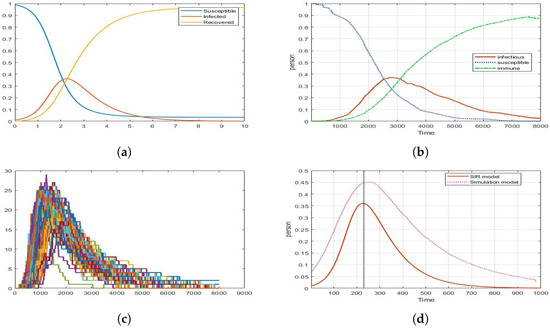 Graph of SIR model and simulation model when : (a) SIR model (); (b) simulation model (); (c) dynamics of Infected in simulation model (100 reps); (d) dynamics of infected that matches the peak point through time scaling.