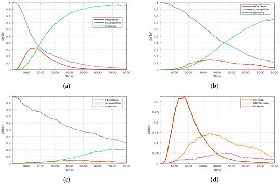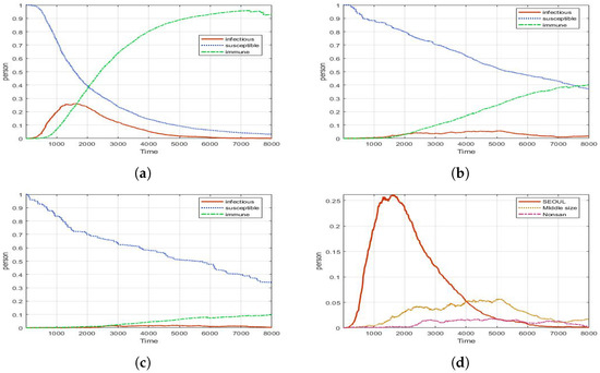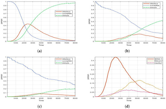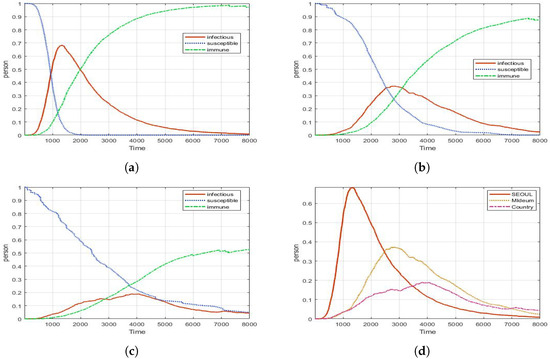 Experimental results for PCR test (with different density of population): (a) Seoul (peak: 0.26, 1668 ticks); (b) Metro city (peak: 0.05, 5070 ticks); (c) Country (peak: 0.01, 4886 ticks); (d) Infectious for all areas.