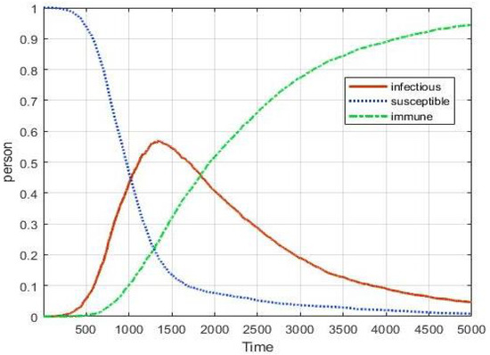 Changing the number of S to the number of I depends on the infection rate () and changing the number of I to the number of R depends on the recovery rate (). In addition, the basic infection reproduction number () can be estimated using infection rate () and recovery rate (), which is very important information for disease control [10].