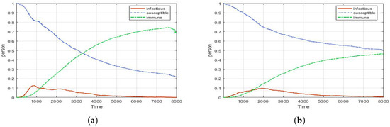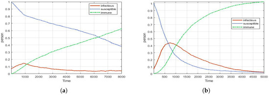 In Figure 6, it shows the dynamics of infectious, susceptible, and recovered people in CP with different densities of GP. This result shows that the spread pattern is different depending on the density. Depending on the population density, the peak number, the time to reach the peak, and the spread period of the disease are different.