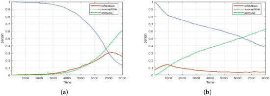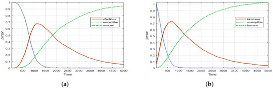 Figure 5 is a graph of comparison between the mathematical model and the simulation model. The same value is applied to each model, and the trend line of the graph is compared. The graph in the mathematical model seems to be deterministic. However, we can see that the ABM model is slightly different from the mathematical model. The ABM model shows the stochastic result similarly to Figure 5c. So, 100 replications were carried out and the average value of the experimental results are expressed as a graph in Figure 5b. In addition, it is confirmed that there is no skewedness of data through comparison of average and median value. At this time, it is confirmed that Figure 5a,b are expressed as a graph with a similar trend. In addition, we check the similarity of the two graphs through time scaling. In Figure 5d, it can be seen that the ABM model overestimates the number of infected people more than the mathematical model. Further, there seems to be a difference in the slope and curve of the graph are. It seems to indicate that the random behavior of agents is well reflected in our ABM model. Although the two models are not perfect matches, their peak points and the graph trend are similar.